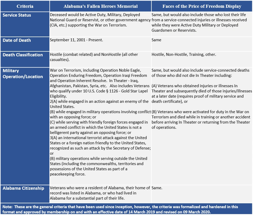 The Blue Star Salute Foundation similarly created a traveling “Faces of the Price of Freedom” display which includes the Alabamians who died on active duty and those who received illnesses or injuries and later died as a result of these illnesses or injuries which they received in support of the War on Terrorism. This display is erected at Veterans Events and schools across Alabama to ensure that these brave Alabamians who made the ultimate sacrifice are never forgotten.